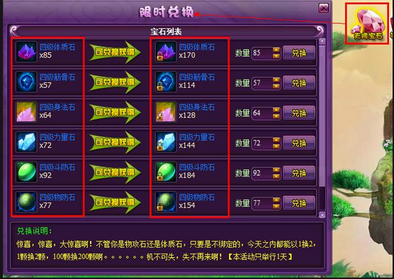 2、玩家背包内每1个不绑定的宝石,都可以免费兑换成2个绑定宝石;
