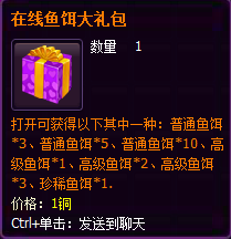 活动期间,玩家每天累计在线达到60分钟,可以获得1个在线鱼饵大礼包,