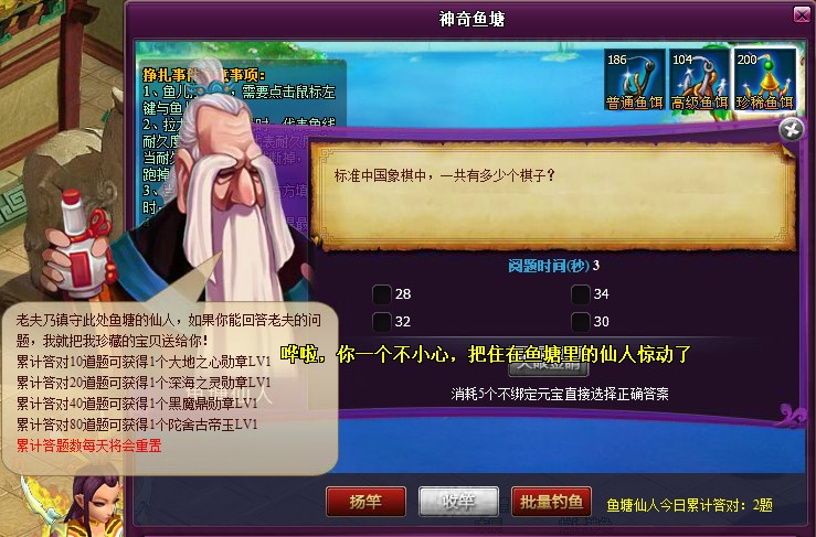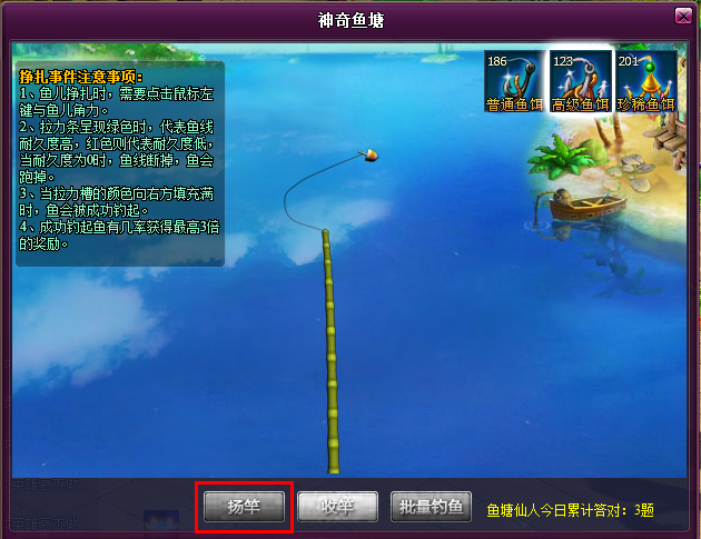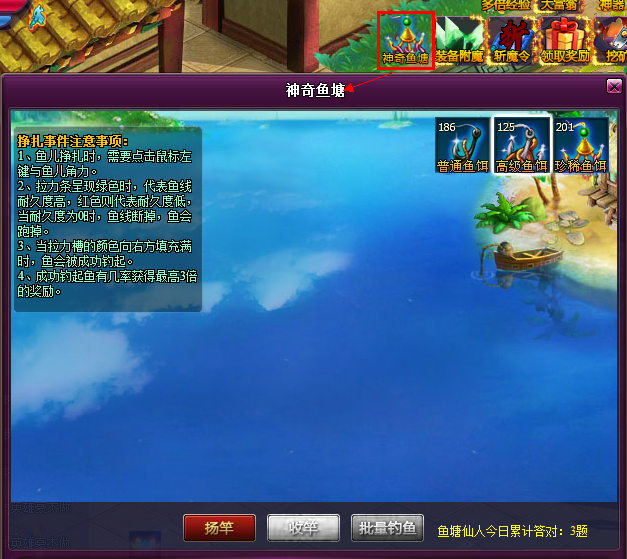 1.活动期间,点击界面上的神奇鱼塘图标,会弹出鱼塘界面,玩家可以在鱼塘界面中钓鱼,每钓一次需要消耗一个鱼饵,可选用的鱼饵有普通鱼饵,高级鱼饵,珍稀鱼饵,分别可以钓到不用的鱼,在商城中可以购买鱼饵礼包