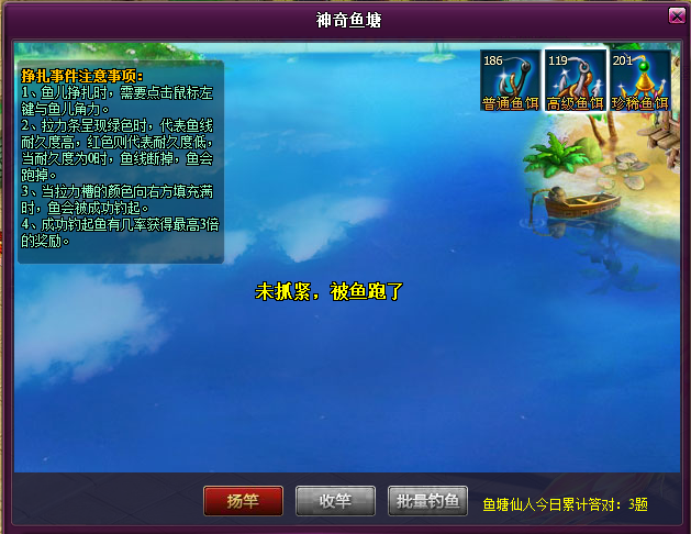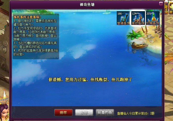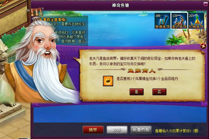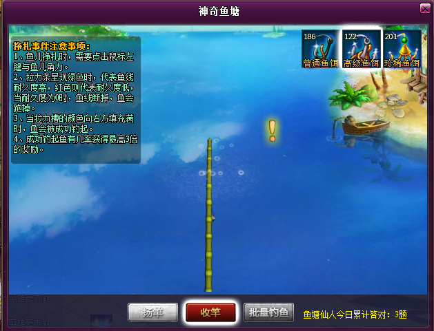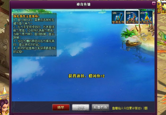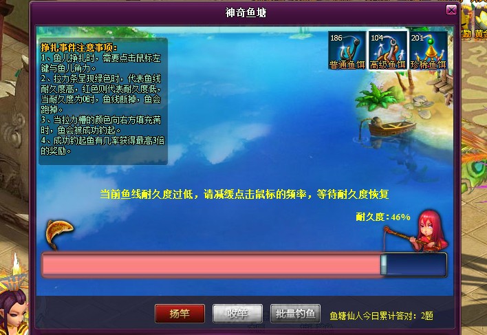 注意:使用批量钓鱼功能时,将不会发生鱼塘仙人,鱼族商人和剧烈挣扎事件,相反会增加获得鱼塘之主挑战令的几率!