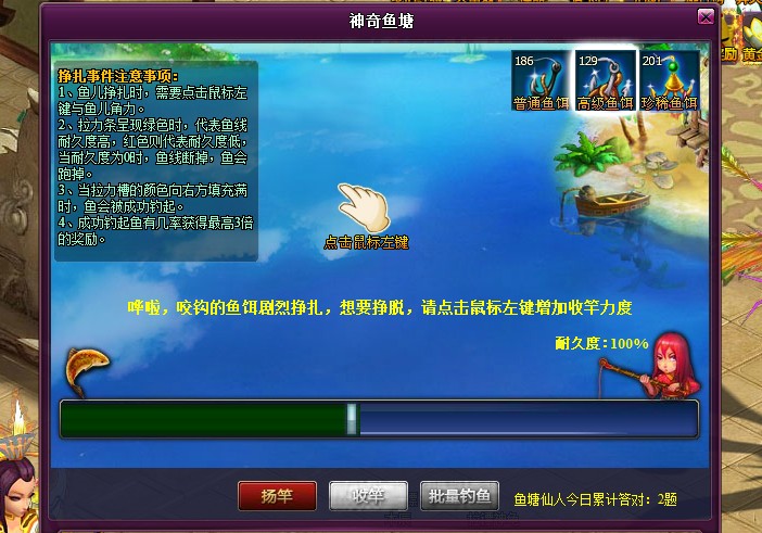 剧烈挣扎事件——当鱼上钩的时候,有几率会触发鱼儿挣扎事件,此时需要点击鼠标左键,收紧鱼线,将鱼钓上来