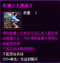 使用珍稀鱼饵垂钓时,将有几率可以钓到鱼塘之主挑战令,