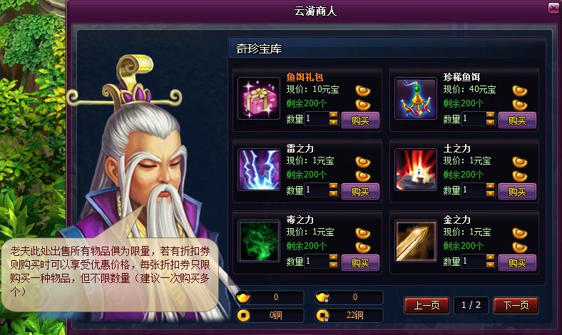 3.云游商人所出售道具都是限量的,售完即止,需要等待下一次云游商人再出现时,道具数量才会刷新