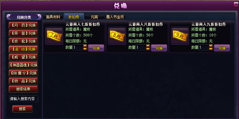 4.折扣券分为7折,8折,9折三种,兑换每种折扣券所需的魔核数量不同
