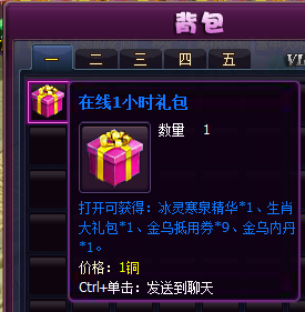 2.在线礼包可开出冰灵寒泉精华,勋章,金乌内丹及金乌抵用券等道具