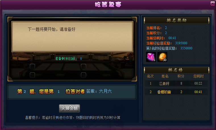 每答对一道题都可以获得大量的经验,答错则只获得70%的经验,前十名答对题目的玩家视为抢答成功,可以获得双倍的经验奖励