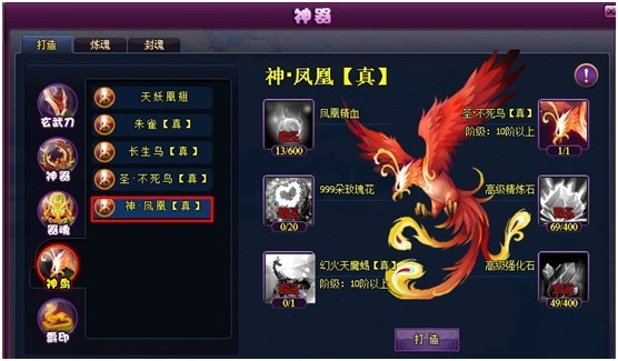 5、神器系统新增【神•凤凰】打造,驾驭此坐骑,玩家有概率触发释放神秘坐骑效果技能——凤凰涅槃。