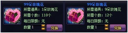 6、兑换商城的【物品】兑换增加玫瑰花兑换功能:110个一朵玫瑰花兑换一束99朵玫瑰花、12个9朵玫瑰花兑换一束99朵玫瑰花。