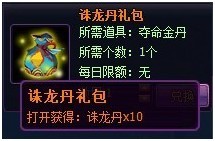2、取消了原在屠龙战场中夺命金丹的售卖,并增加新道具【诛龙丹】售价9元宝,使用此物可以在屠龙战场中对龙族BOSS造成5000W伤害,每次最高可获得6000威望奖励。原夺命金丹可以在兑换界面的【物品兑换】里面兑换成诛龙丹礼包,该礼包内含诛龙丹10个。