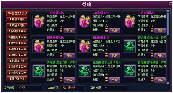 1)1-5阶的任意普通神器(乾坤阳罗盘、乾坤阴罗盘、封天印、翻天印)可以兑换对应阶位的【神器礼包】。