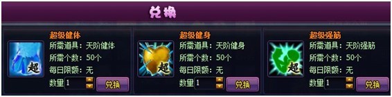 3)通用技能--超级强筋(增加主人筋骨5000点)、超级健身(增加主人身法5000点)、超级健体(增加主人体质10000点)。玩家可以在兑换商城中使用50本相对应的天阶技能书才能兑换超级技能,伙伴第四形态才可以进行学习,伙伴学习之后将大幅度增加主人属性!