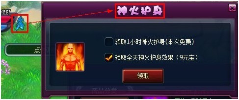 6、新增vip等级特权buff—神火护身,此buff可大幅度提高玩家的攻、防、血属性,vip等级越高buff的属性越强。玩家每天可免费领取一小时神火护身buff,使用元宝可全天使用,每天24点会清空buff效果。