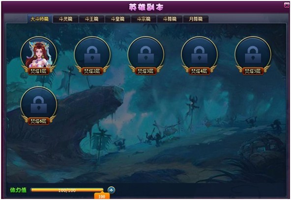 1)英雄副本根据玩家的境界开启相应的境界篇章,开启条件:大战师