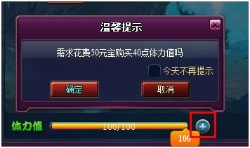 3)当体力值不够时,玩家可点击体力值进度条右边的”+”号,可使用元宝购买体力(目前每天只能购买一次)。