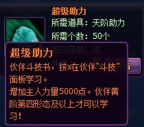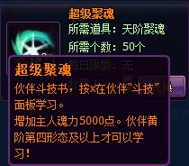 3、新增伙伴通用技能—超级助力(增加主人身法5000点)、超级聚魂(增加主人魂力5000点)。玩家可以在兑换商城中使用50本相对应的天阶技能书可以兑换这两种超级技能,并且黄阶伙伴第四形态方可学习。