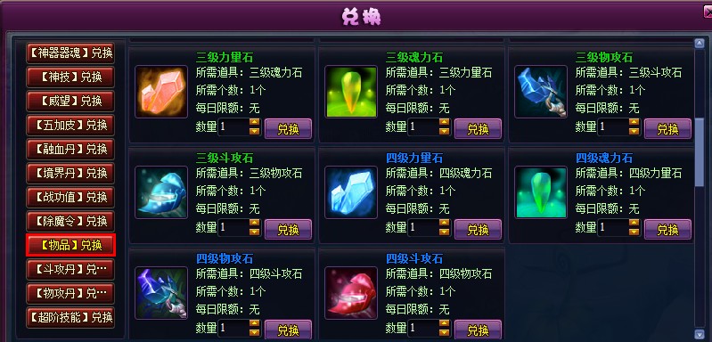 4、【兑换商城】--【物品】兑换栏新增三级攻击类宝石互相兑换、四级攻击类宝石互相兑换功能(攻击类宝石:魂力石、力量石、斗攻石、物攻石)。