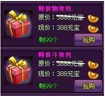 活动期间仅三天,伙伴、锻造、神火界面增加超值限量礼包【特价物攻包,特价斗攻包,特价闪避包,特价体悟包,特价洗灵包,小医仙召唤令,特价强化包Ⅰ,特价打孔包Ⅰ,特价镶嵌包Ⅰ】,活动期间每天限量出售,不要错过机会喔!