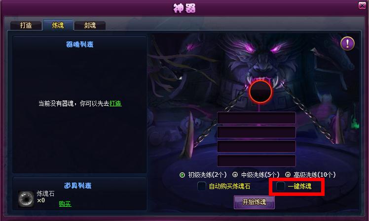 4.vip10以上新增一键炼魂功能,点击一键炼魂后会将器魂所有属性提升到最接近的颜色,依次为白,绿,蓝,紫,橙