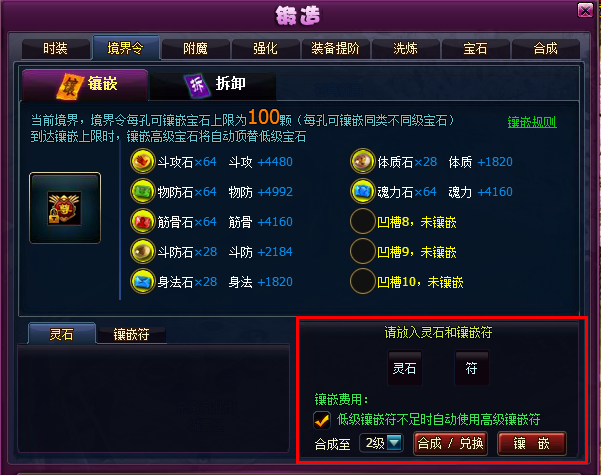 3.锻造境界令界面增加一键兑换/合成宝石功能。