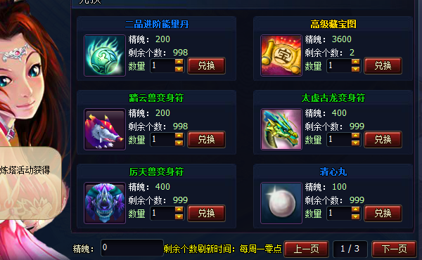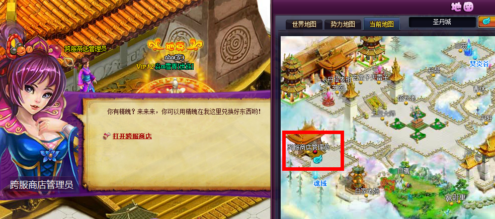 玩家可以到圣丹城(39,107)坐标的跨服商店管理员处打开跨服商店,以及使用精魄兑换物品。