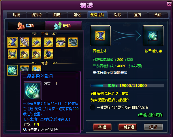 二品进阶能量丹:一种蕴含神奇能量的材料,金色装备吞噬它可获得200点进阶能量。能量丹只能通过点击“吞噬”操作使用(一键吞噬不会吞噬掉进阶能量丹),不能直接使用。