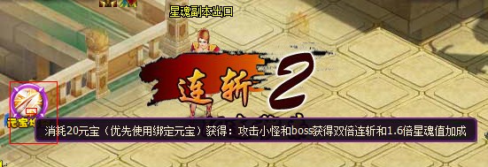 星魂副本增加加成buff:购买花费20元宝(优先使用绑定元宝)购买加成buff后击杀小怪和boss获得双倍连斩和1.6倍星魂值。