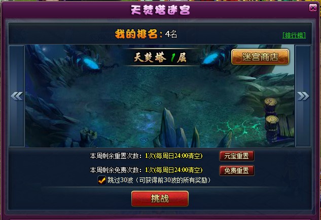 7.天焚塔迷宫增加免费重置和累加重置次数;