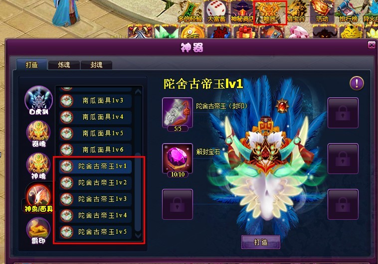 低等级的陀舍古帝玉可以在神器-神鸟/面具处打造合成高等级的陀舍古帝玉。如下图: