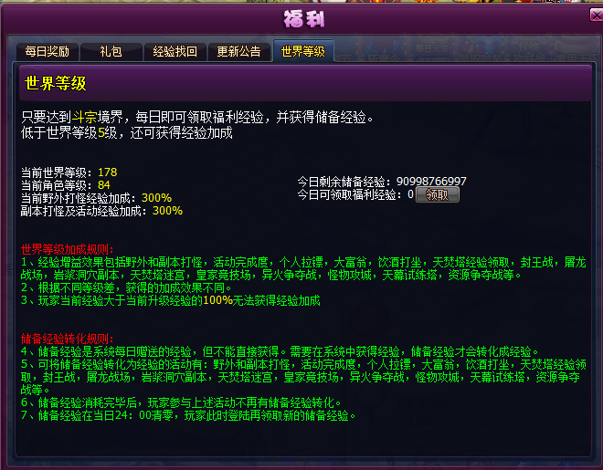 2)世界等级越高,获得的福利经验及储备经验也越高。