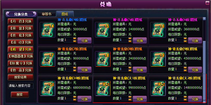 主神器图纸可以在兑换商城-【威望】兑换-图纸 处兑换,天1阶需要花费99000000威望,天2阶需要花费148000000威望。如下图所示: