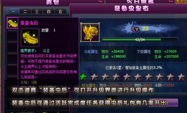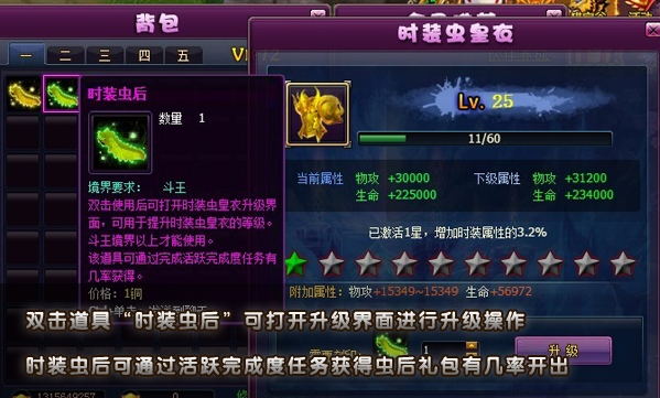2)双击使用道具“装备虫后”可提升装备虫皇衣等级,双击使用道具“时装虫后”可提升时装虫皇衣等级。相关道具“装备虫后”和“时装虫后”可以通过活跃度礼包获得,也可在充值和消费活动中可获得。