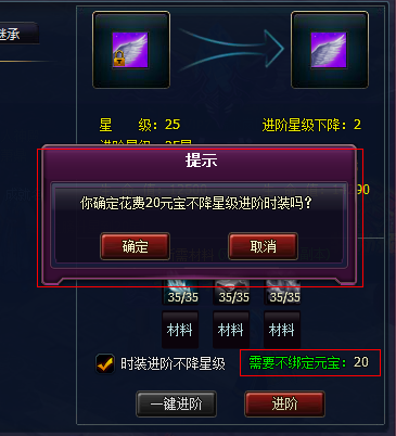 2)玩家勾选“时装进阶不降星级”点击进阶时,将会告知具体消耗元宝,点击确认方可提阶。
