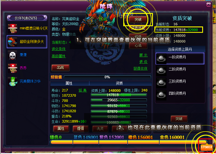 可以在伙伴突破界面查看伙伴的当前资质;也可以在伙伴最下边的黄色资质条查看该伙伴的当前资质,如下图所示: