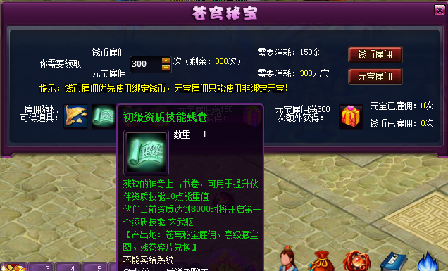 2)苍穹秘宝雇佣新增产出道具:初,中,高级资质技能残卷和中级资质技能兑换券。