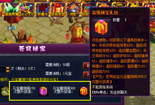 ②元宝雇佣300次苍穹秘宝还可额外获得秘宝礼包和高级秘宝礼包,打开有几率获得中级和高级资质技能残卷。
