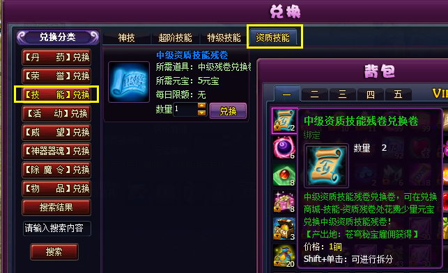 ③使用残卷兑换卷到兑换商城-【技能】兑换-资质技能兑换获得