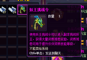 ⑤妖王挑战令,使用后挑战妖王成功可获得大量高级伙伴资质技能残卷