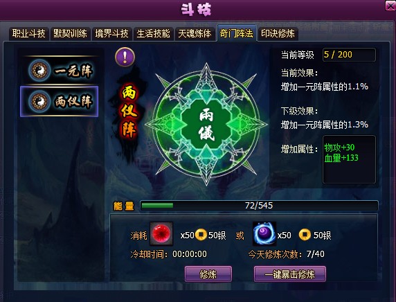2)修炼两仪阵法可额外增加一元阵法的百分比属性,等级越高,增加的百分比越高。