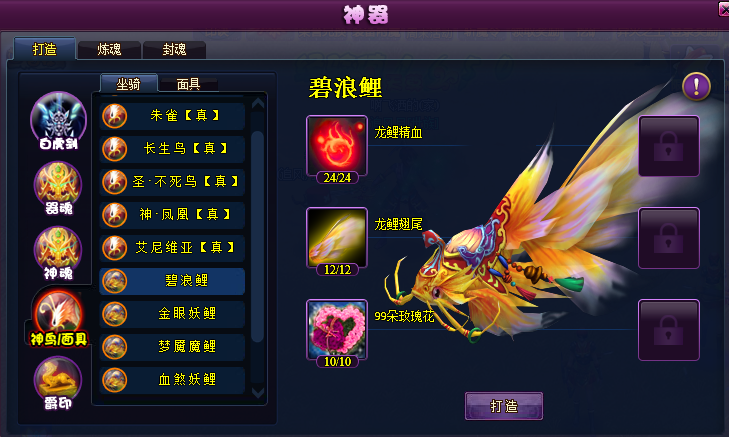2. 人物达到洪尊境界后,可在神器界面-神鸟/面具-坐骑上直接打造新的坐骑,龙鲤坐骑系列的所有坐骑都可直接打造获得。