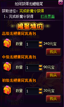 2龙鲤翅尾可在洪尊境界后的斩魔令完成后奖励获得,也可直接可以点击购买按钮购买礼包(每个礼包每天只能买一个)获得,如下图: