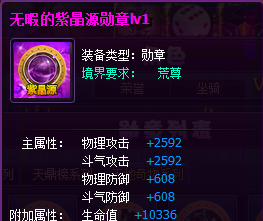 2)天地奇物系列勋章总共有12个,分别是紫晶源、冰灵寒泉、七幻青灵涎、青木仙藤、地心淬体乳、天山血潭、地心珠、孕灵粉尘、地心魂髓、魂婴果、龙凰本源果、菩提心。基础属性增加攻击、防御、血量。