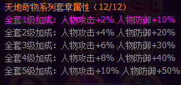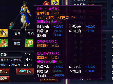 3)套章属性:天地奇物系列勋章的套章属性是攻击加成与防御加成