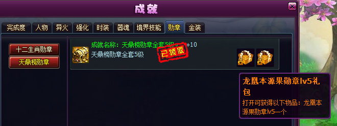 3)天地奇物系列勋章可以在兑换商城使用十二生肖勋章或者天鼎榜勋章兑换天地奇物勋章礼包。