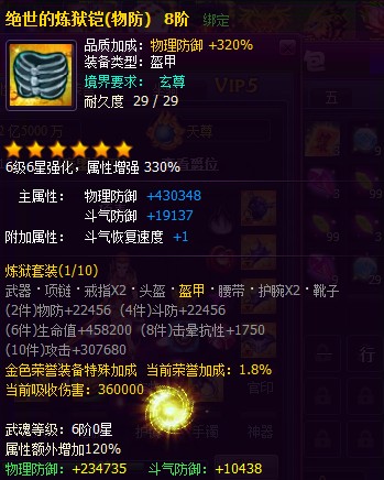 4)满阶时,头盔,铠甲,鞋子,腰带,护腕类攻击防御装备最高可额外增加120%属性。