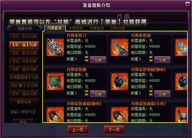 1.在装备指引介绍的第二页新增“荣誉套装”兑换指引界面