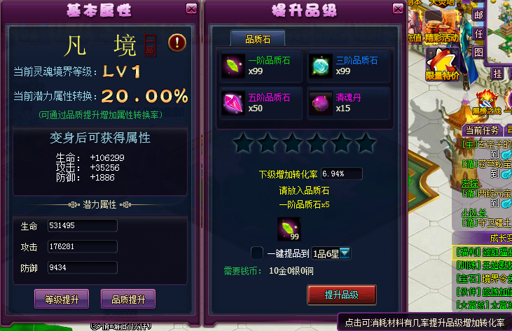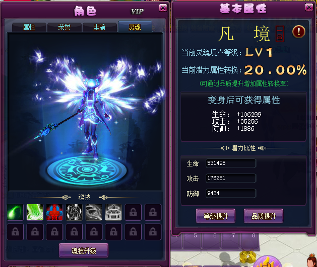 灵魂品质提升后,可以增加潜力属性的转换率,极大提高变身时附加到角色上的属性值,大大增加自身实力。