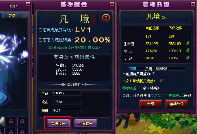 点击灵魂界面的“等级提升”按钮,可以进入灵魂升级界面。