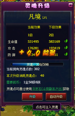 灵魂升级有两个按钮,“升级”按钮是单次升级操作,玩家点击一次会消耗固定的灵魂点增加对应能量值,能量值满后灵魂等级提升1级。