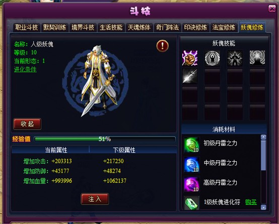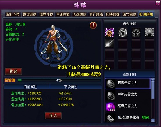 直接点击注入按钮可消耗背包中的丹雷之力道具使妖傀增加经验升级。妖傀升级后将增加攻击,防御,血量属性,都将直接赋予到角色身上。