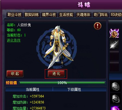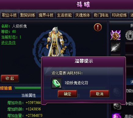 ② 当妖傀达到60级满经验时自动弹出“进化”按钮。不同的妖傀进化时需消耗相应的妖傀进化符。